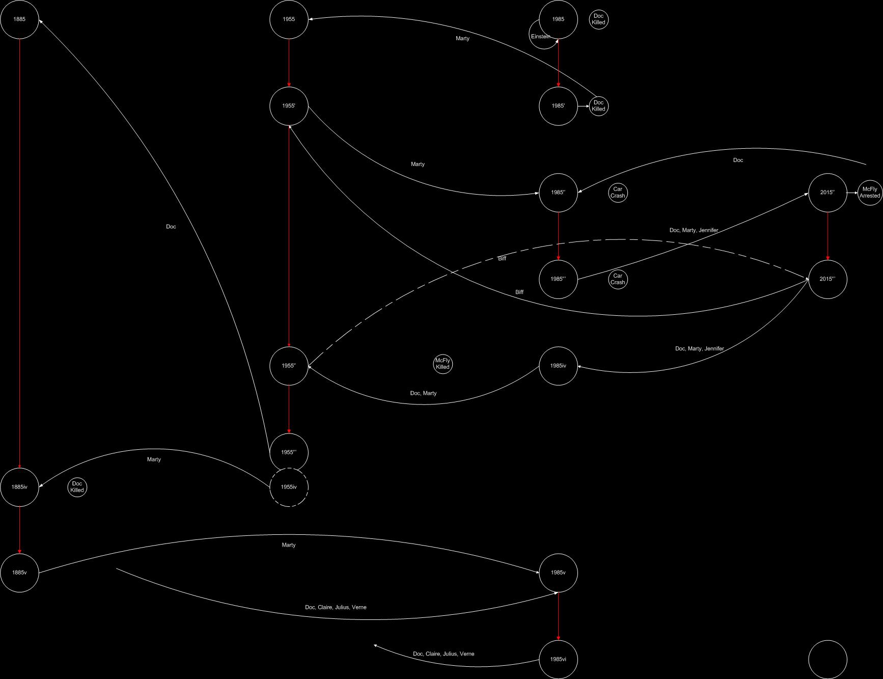 After this, the Doc of 1985» made several travels, according to his suitcase full of bills from different times, and from somewhere in the future, after the events of 2015» he come back to 1985». Again we have to trust in the very careful behaviour of the Doc in his travels to the past to be able to come back to a 2015» and a 1985» that matches with the reality where Marty is. The Doc then, takes Marty and Jennifer from a 1985»’ just created with very or no influence to a 2015» where the son of Marty went to jail creating a new 2015»’ to avoid that. However Biff overhearing the conversation between Marty and the Doc about the risks of the information in the Sports Almanac bought by Marty and related the DeLorean to the one he saw in 1985» follows them and steal the time machine to travel to 1955′, where Marty is struggling to come back to 1985′ and gives himself the sport almanac changing the whole curse of the timeline, now 1955». Biff came back to 2015»’ and leaves the time machine in the place from where it was stolen. Heres is one of the first paradox, Biff coming back from a new 1955» should reach a different 2015»’ where he should be rich and wealthy, no tot he same 2015»’ where Marty and the Doc are rescuing Jennifer from the 2015»’ McFly house. Jennifer and Marty know about the tragic accident that occurred to Marty in that timeline in the 1985»’. However after coming back to 1985»’ they appear instead in 1985iv the timeline generated from 1955» after 2015»’Biffs trip. in 1985iv Biff is a rich man due to his bets in sports, George McFly was killed years before in 1973. The city is violent and unsafe. The Doc aware of what happened took Marty back to 1955» creating a new 1955»’ where they take the almanac from biff restoring the reality they wanted, but the night of the storm when they planned to come back to a «restored» 1985 the flying DeLorean is struck by a light and sent back to 1885, for convenience, creating a 1885iv, minutes after it a postman delivers a 70 years old letter sent by the doc alive in 1885 and Marty looks again for the 1955 Doc, now the 1955»’Doc. Here is the 2nd Paradox, in the timeline where Marty is (1955»’), there is no Doc in 1885 who could have sent a letter. It could have happened in a hypothetical 1955iv, some how Marty went through a wormhole during the storm and appear in another reality to receive the letter.